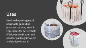 Our ventilated polypropylene big bags are ideal for packaging potatoes, onions, garlic, wood logs, and charcoal, ensuring product integrity across supply chains.